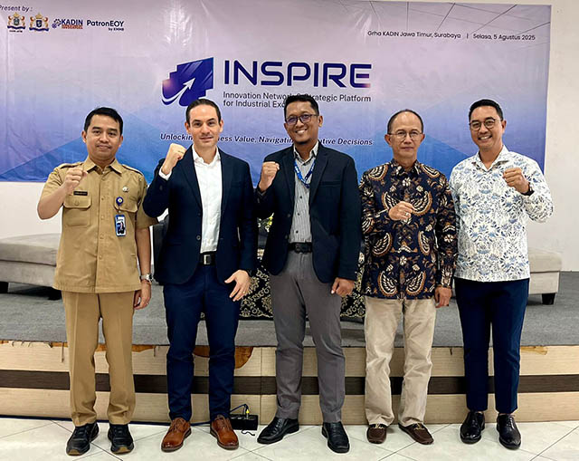Sekretaris Bappeda Jatim Andhika Paratama Herlambang, Ekonom DR. Miguel Angel Esquivias, Direktur Utama Konsultan Manajemen Mohamad Badowi (KMMB) Okky Widya Prananta, Ketua Umum Kadin Jatim Adik Dwi Putranto, Wakil Ketua Kadin Surabaya Medy Pramkoso di sela acara “Inspire, Innovation Networking & Strategic Platform for Industrial Excellence” di Surabaya, Selasa (05/08/2025). Foto: Kadin Jatim