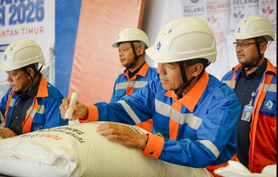 Direktur Utama Pupuk Kaltim, Gusrizal melakukan seremoni penandatanganan karung pupuk dalam acara Tutup Tahun Produksi 2025 di area gudang Pabrik 1A Pupuk Kaltim di Bontang, Kalimantan Timur.